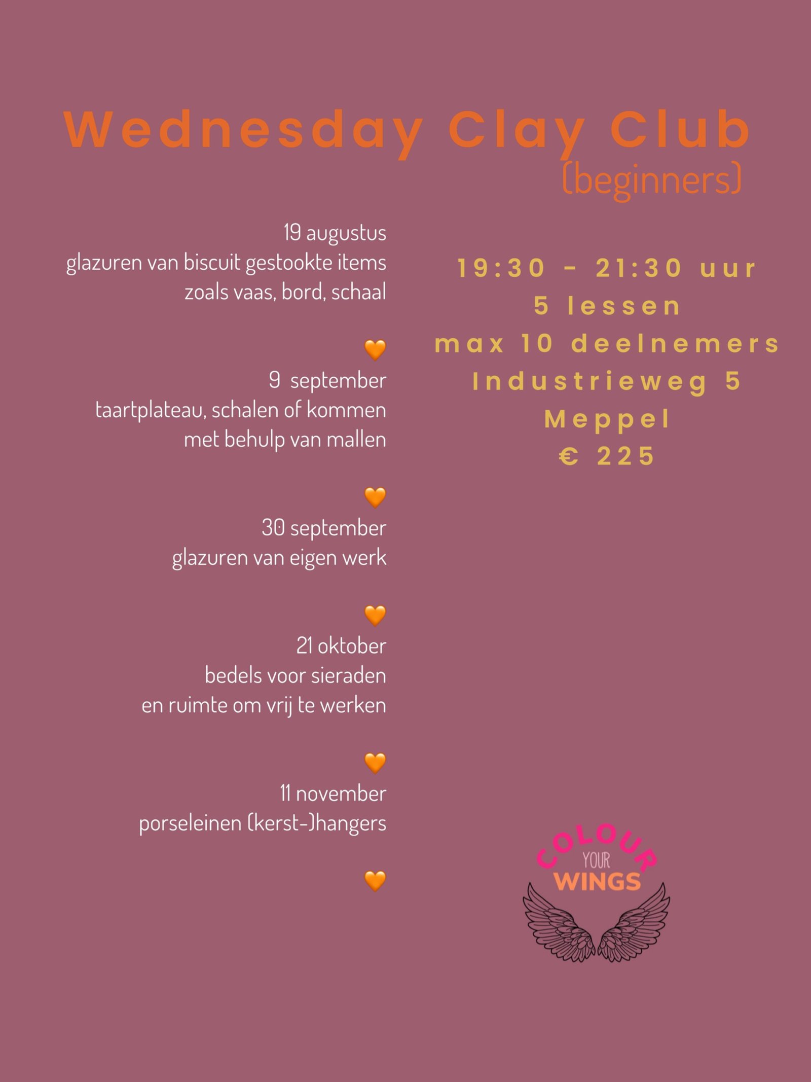 Deze gezellige keramiekcursus bestaat uit 5 lessen en is geschikt voor iedereen die het leuk lijkt om te experimenteren met klei en glazuur. Heb je al wat ervaring? Ook dan is er voldoende mogelijkheid om mooie dingen te maken in groepsverband.