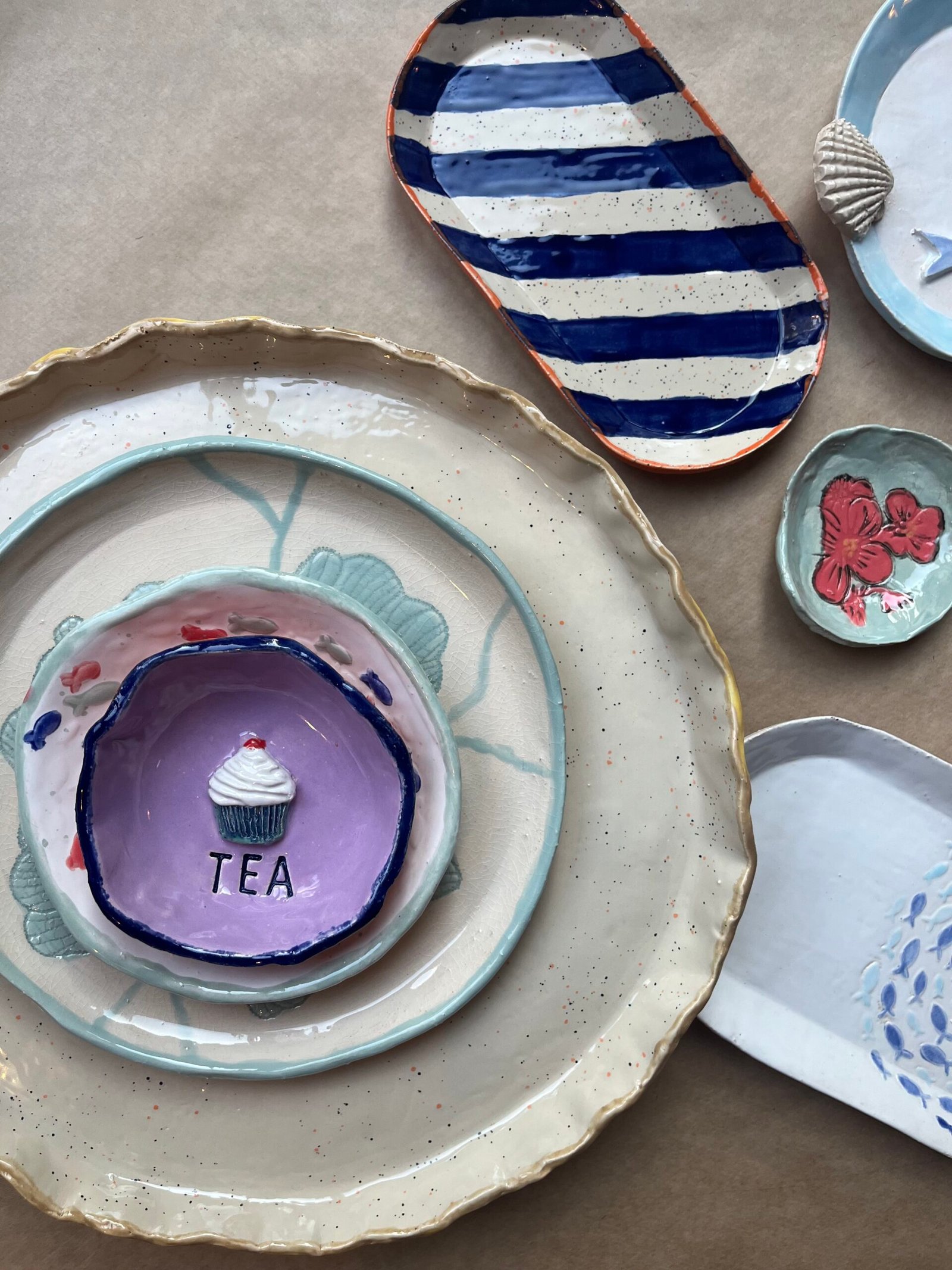 Wanneer de schaaltjes netjes door jou zijn afgewerkt worden ze gebakken in de keramiekoven. Daarna spreken we over ‘biscuit’. Tijdens het tweede deel van je workshop ga je de schaaltjes decoreren met glazuur. Worden het vrolijke strepen, een schilderachtig tafereel of heb je nog een ander idee; er is van alles mogelijk!
